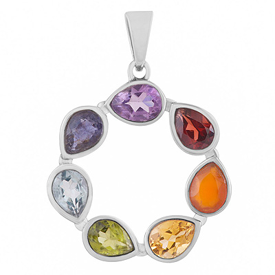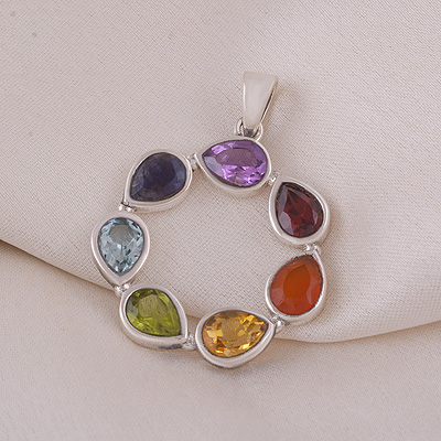 Beautiful Chakra Gemstones Around Amethyst,Iolite,Blue Topaz,Peridot,Citrine,Carnelian,Garnet Pear Shape 925 Sterling Solid Silver Pendant