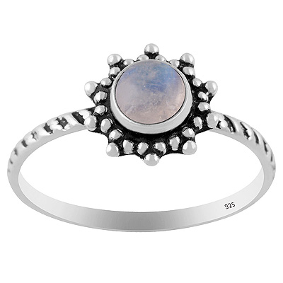 Home | Silver Rings | Cabochon Rings | Classic Rawa Work Around Rainbow Moonstone Round Shape 925 Sterling Solid Silver Ring
