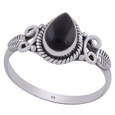 Gorgeous Textured leaf & Twisted Wire Work Around Black Onyx Pear Shape 925 Sterling Solid Silver Ring