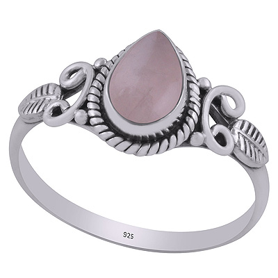 Gorgeous Textured leaf & Twisted Wire Work Around Rose Quartz Pear Shape 925 Sterling Solid Silver Ring