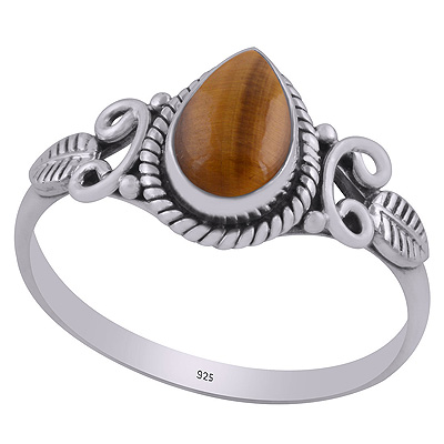 Gorgeous Textured leaf & Twisted Wire Work Around Tiger's Eye Pear Shape 925 Sterling Solid Silver Ring