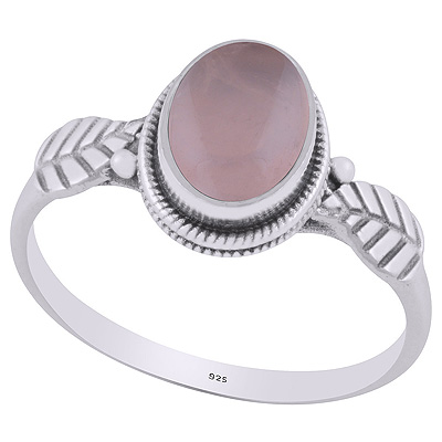 Alluring Textured Leaf Around Rose Quartz Oval Shape 925 Sterling Solid Silver Ring