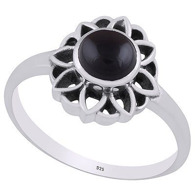Gorgeous Oxidised Flower Work Black Onyx Round Shape 925 Sterling Solid Silver Ring