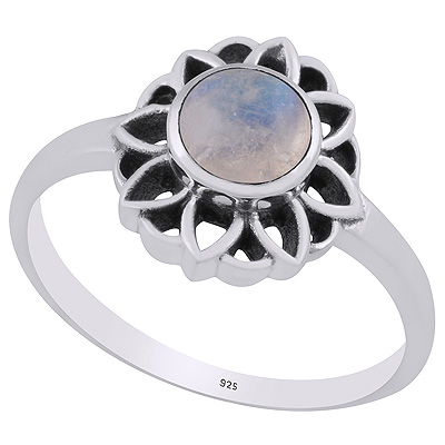 Gorgeous Oxidised Flower Work Rainbow Moonstone Round Shape 925 Sterling Solid Silver Ring