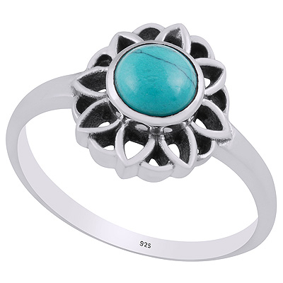 Gorgeous Oxidised Flower Work Turquoise Round Shape 925 Sterling Solid Silver Ring