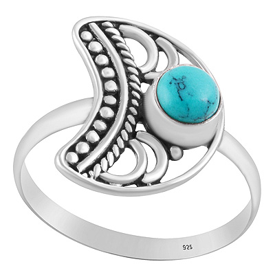 Alluring Crescent Moon Rawa Work Around Turquoise Round Shape 925 Sterling Solid Silver Ring