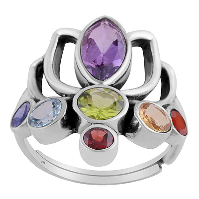 Beautifully Flowar Chakra Gemstone Around Amethyst,Iolite,Blue Topaz,Peridot,Citrine,Carnelian,Garnet Multi Shape 925 Sterling Solid Silver Ring
