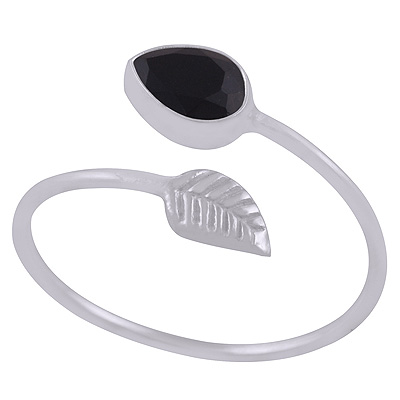 Classic Textured Leaf With Black Onyx Pear Shape 925 Sterling Solid Silver Ring