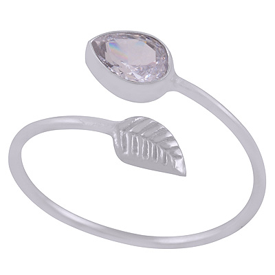 Classic Textured Leaf With White Cubic Zirconia Pear Shape 925 Sterling Solid Silver Ring