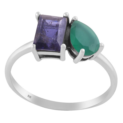 Stunning Multicolour Gemstones Studded Iolite,Green Onyx Rectangle,Pear Shape 925 Sterling Solid Silver Ring