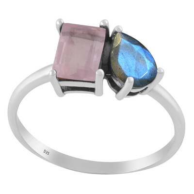 Stunning Multicolour Gemstones Studded Rose Quartz,Labradorite Rectangle,Pear Shape 925 Sterling Solid Silver Ring