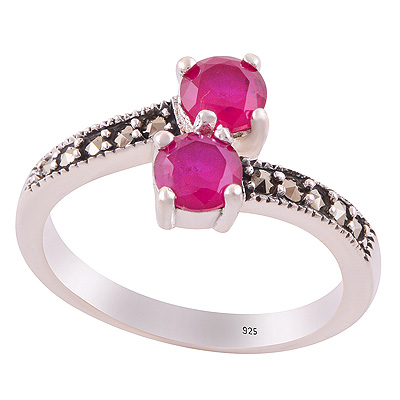 Alluring Oxidised Work Around Marcasite,Red Corundum Round Shape 925 Sterling Solid Silver Ring