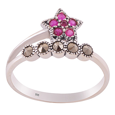 Gorgeous Oxdised Star Patter Around Marcasite,Red Corundum Round Shape 925 Sterling Solid Silver Ring