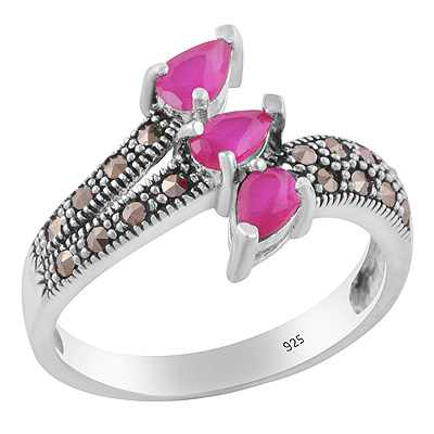 Stunning Oxdised Gemstone Studded Around Marcasite,Red Corundum,Green Onyx,Cubic Zirconia Pear,Round Shape 925 Sterling Solid Silver Ring