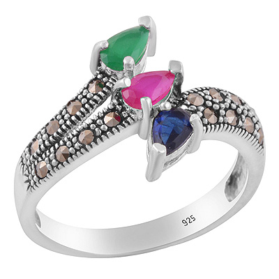 Stunning Oxdised Gemstone Studded Around Marcasite,Red Corundum,Green Onyx,Cubic Zirconia Pear,Round Shape 925 Sterling Solid Silver Ring