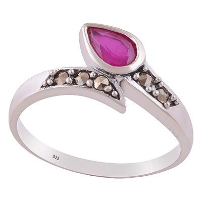 Beautiful Oxdised Patter Around Marcasite,Red Corundum Pear,Round Shape 925 Sterling Solid Silver Ring