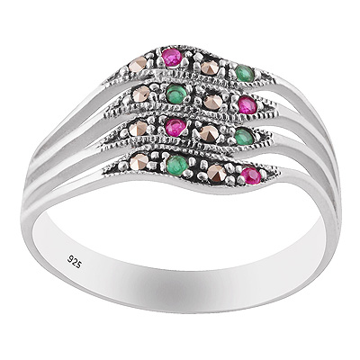Alluring Layered Studded Gemstones Marcasite,Red Corundum,Green Onyx Round Shape 925 Sterling Solid Silver Ring