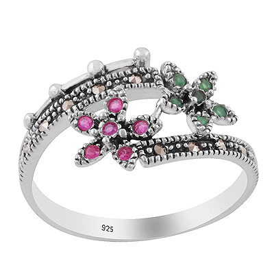 Beautiful Flower Studded w/ Gemstones Marcasite,Red Corundum,Green Onyx Round Shape 925 Sterling Solid Silver Ring