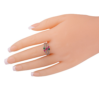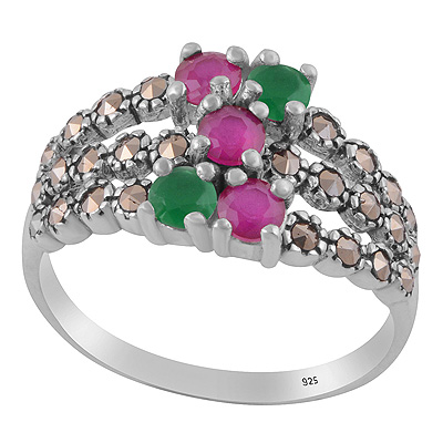 Gorgeous studded w/ Gemstones Marcasite,Red Corundum,Green Onyx Round Shape 925 Sterling Solid Silver Ring