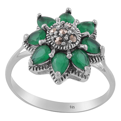 Alluring Flower Studded w/ Gemstones Marcasite,Red Corundum,Green Onyx Pear,Round Shape 925 Sterling Solid Silver Ring