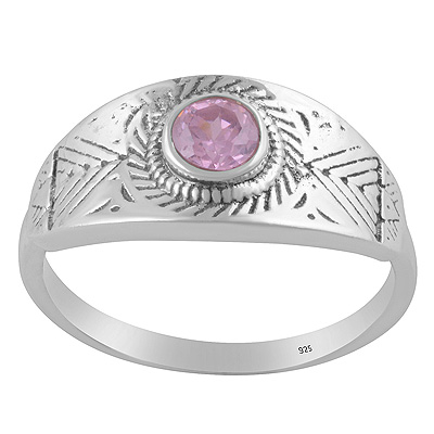 Gorgeous Texture Patterns Around Pink Cubic Zirconia Round Shape 925 Sterling Solid Silver Ring