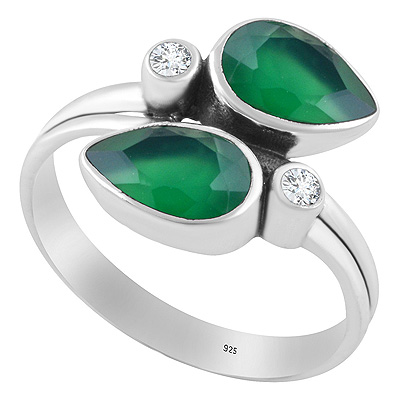 Alluring Multiple Gemstones Green Onyx,White Cubic Zirconia Pear,Round Shape 925 Sterling Solid Silver Ring